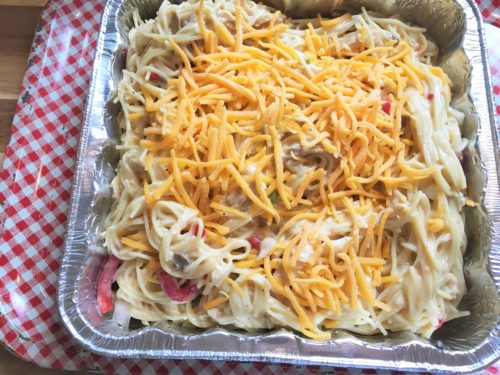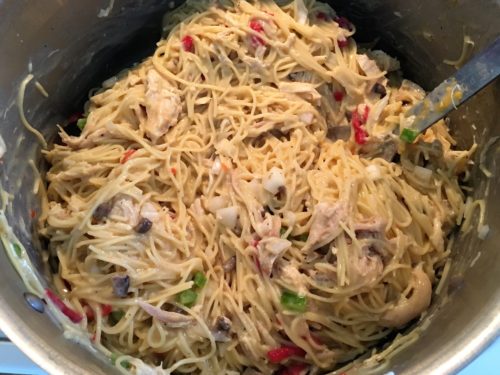 I am always looking for more good recipes with chicken. I can never seem to have quite enough of them. 🙂 This Cheesy Chicken Spaghetti is a mainstay at our home; it’s origin comes from Ree Drummond, also know as The Pioneer Woman. Thank you, Ree, for introducing this dish to me.
