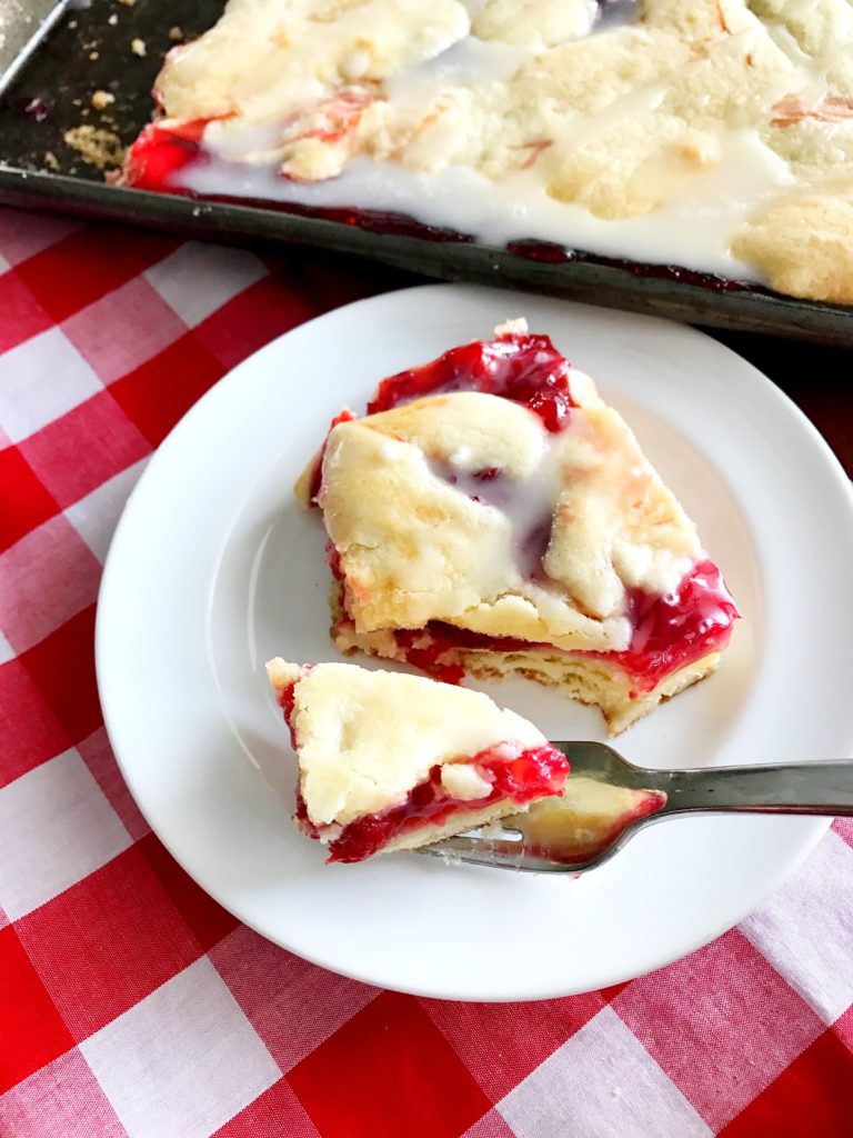 These Cherry Pie Bars are great for the occasion. I no longer have fresh cherries in my freezer so the canned version works well this time of year and also the red color is super festive. If you were feeling extra creative, you could serve the bars as little heart shapes. The added almond extract give the bars an extra added flavor that is hard to resist.