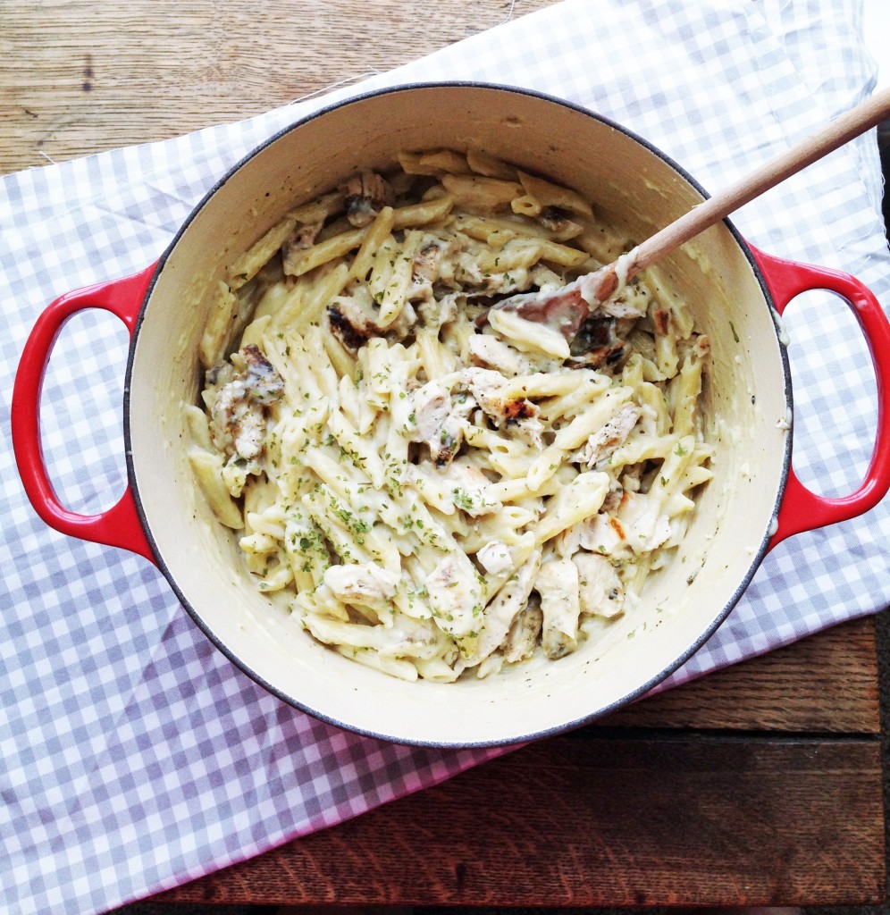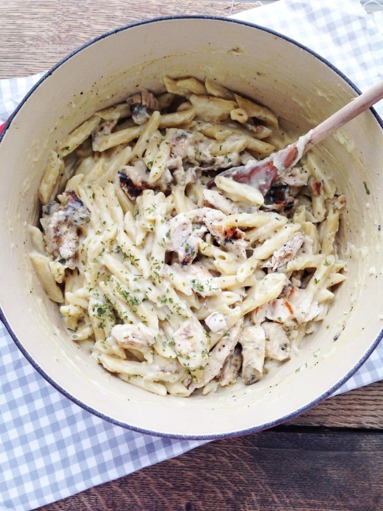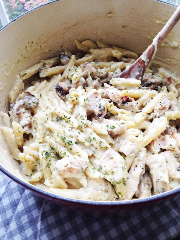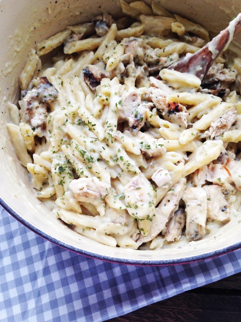 This creamy, garlicky, cheesy, and comforting pasta recipe is simply wonderful. The taste is similar to fettuccine Alfredo, but its a lot healthier! Instead of using heavy cream, I use lighter ingredients of (fat free) cream of chicken and skim milk. I also use whole wheat (or low glycemic) pasta and sometimes add shredded carrots and zucchini to add more nutrition. I love it because it’s an easy recipe the kids can help make.