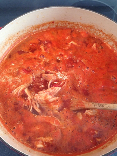 - Add Rotel, tomatoes, chicken broth, chicken, corn, beans, and seasonings. Simmer for an hour.