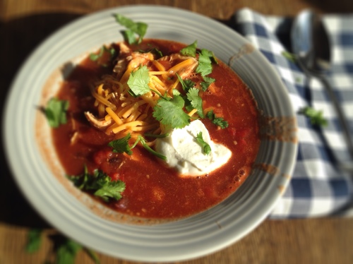 - Top soup with chips, sour cream, cheese, and cilantro.