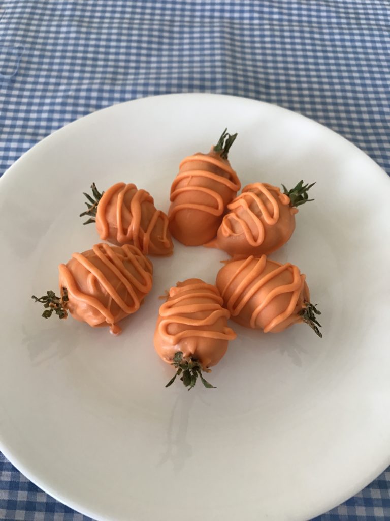 My girls and I had quickly melted a bag of chocolate chips and a little shortening over low heat until shiny and smooth. We dipped each berry and then placed on a cookie sheet that had been covered with wax paper. We popped them into the fridge and they were ready to eat in about a half and hour.