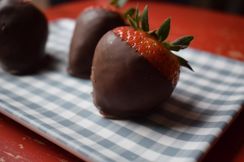 I was invited over to a friend’s house for a girls’ night and thought it would be nice to bring something to share. I was a little short on time and didn’t want to make a trip to the store, but I realized that I had a fresh box of strawberries and a bag of chocolate chips. After doing a bit of googling, I realized that we had all that was needed to make these festive chocolate covered strawberries.