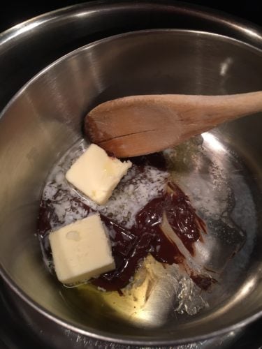 - Melt butter and chocolate in double boiler.