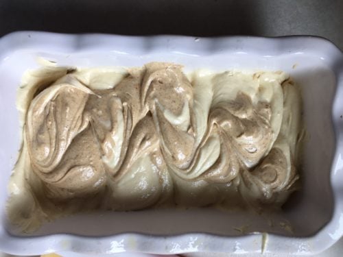 - Pour half of the prepared batter into the bottom of the loaf pan. Spoon half of the cinnamon batter in small dollops overtop the batter. Dot the top with remaining cinnamon batter. Using a butter knife, swirl the two batters together.