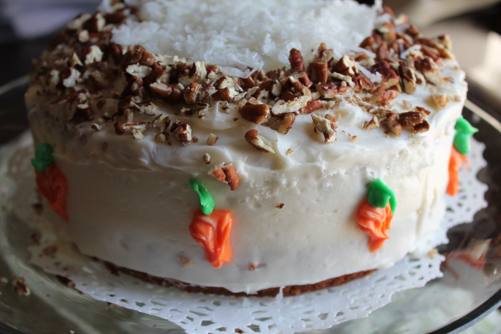 - Gently place the second cake on top and continue frosting. Decorate as desired. I sprinkled chopped pecans and coconut on top.