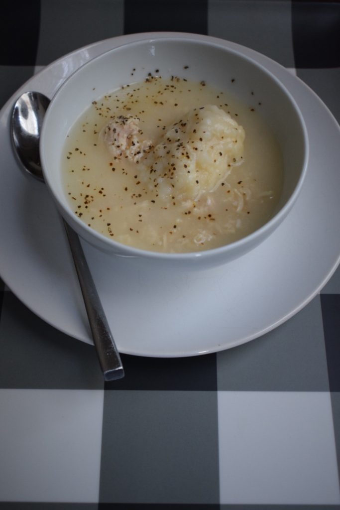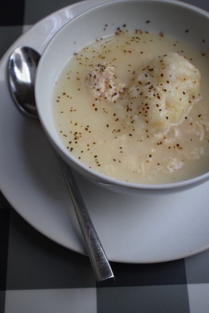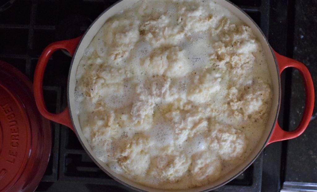 - Drop spoonfuls of the biscuit batter on the top of the broth. There will be around 8-10 dumplings.