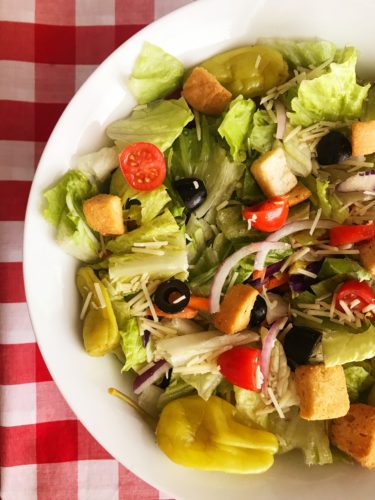 A fresh salad is always the healthy choice, however, in the warmer months of spring and summer it becomes my desirable choice. Something about the fresh, cool ingredients on a warm day hits the spot. I haven’t been to the Olive Garden Restaurant in years, but I remember loving the delicious house salad that comes family style to your table. I would always accidentally fill up on the salad before my meal would come. I could count on a to-go box for my main dish to enjoy the next day.