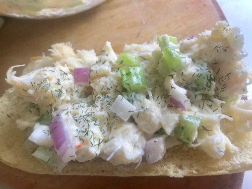 Anyway, I was really surprised to find this simple concoction of crab meat, mayonnaise, celery, onion and a few seasonings. We had this recipe as “sandwiches”, but it would be great as a salad on top of a bed of lettuce or just a snack or appetizer with crackers. It’s light, easy, and refreshing – just the way summer should be! Enjoy!