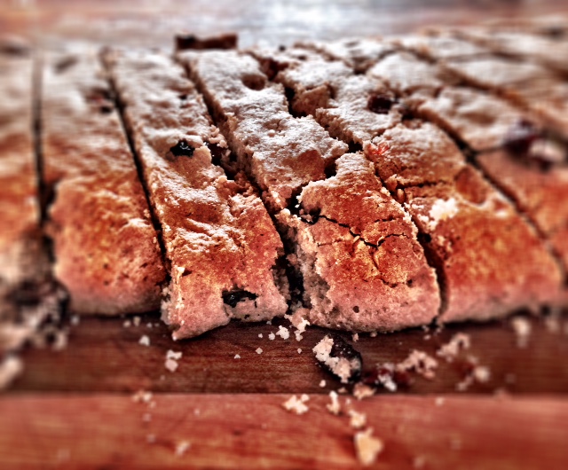 - Place the log on the cutting board. Using a sharp serrated knife, cut the log on a diagonal into ¾-inch-thick slices. Arrange the biscotti on the baking sheet. Bake the biscotti again, for 15 minutes, until they are golden brown. Transfer the biscotti to a rack and cool completely.