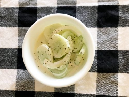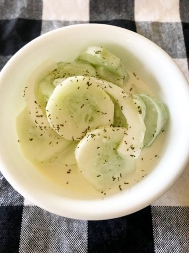 There are about a dozen recipes that take me back to my childhood and this is one of those. Near the end of summer when gardens were flourishing, my Grandma and Mom would always have a bowl (or in my mom’s case a large glass measuring cup) full of cucumbers and onions. They would rotate between this creamy mayo based recipe and a vinegar based recipe. They are both delicious, but of the two this creamy cucumber and onion was my favorite. Fresh and flavorful with a hint of dill (which is optional) seemed to hit the spot on those warm end of summer evenings.