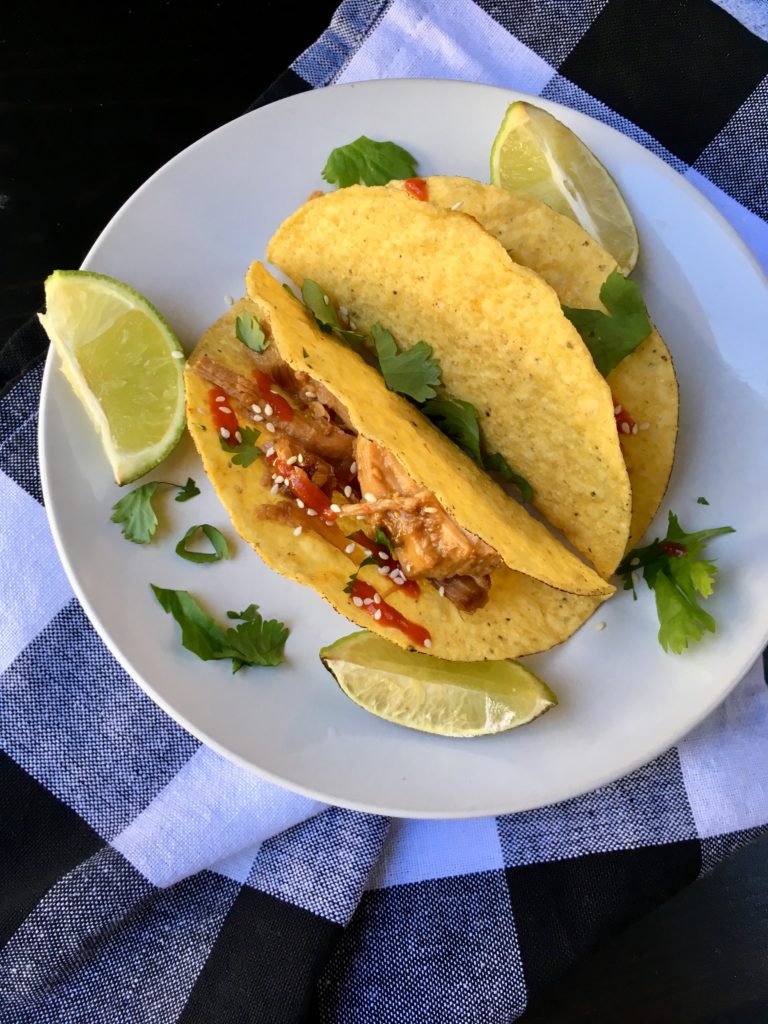 So anyway, back to this delicious pork. We love both Asian and Mexican food, and this meat perfectly fuses the two cuisines. The meat is tender, savory, and a little sweet, and the ginger and sesame seeds really add tons of interesting flavor. We eat it in taco shells topped with sriracha and fresh cilantro. But it could also make a delicious sandwich (perhaps on a Hawaiian sweet bread bun) or in a taco bowl or as the meat in a lettuce wrap. Easy, versatile, and oh so delish! Give it a try; I just know you and your loved ones will really enjoy this one.