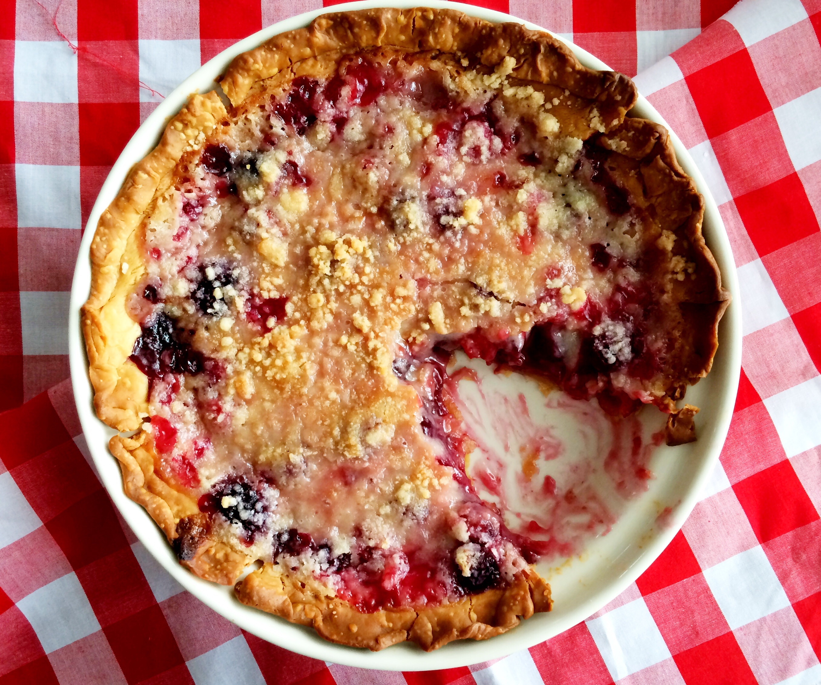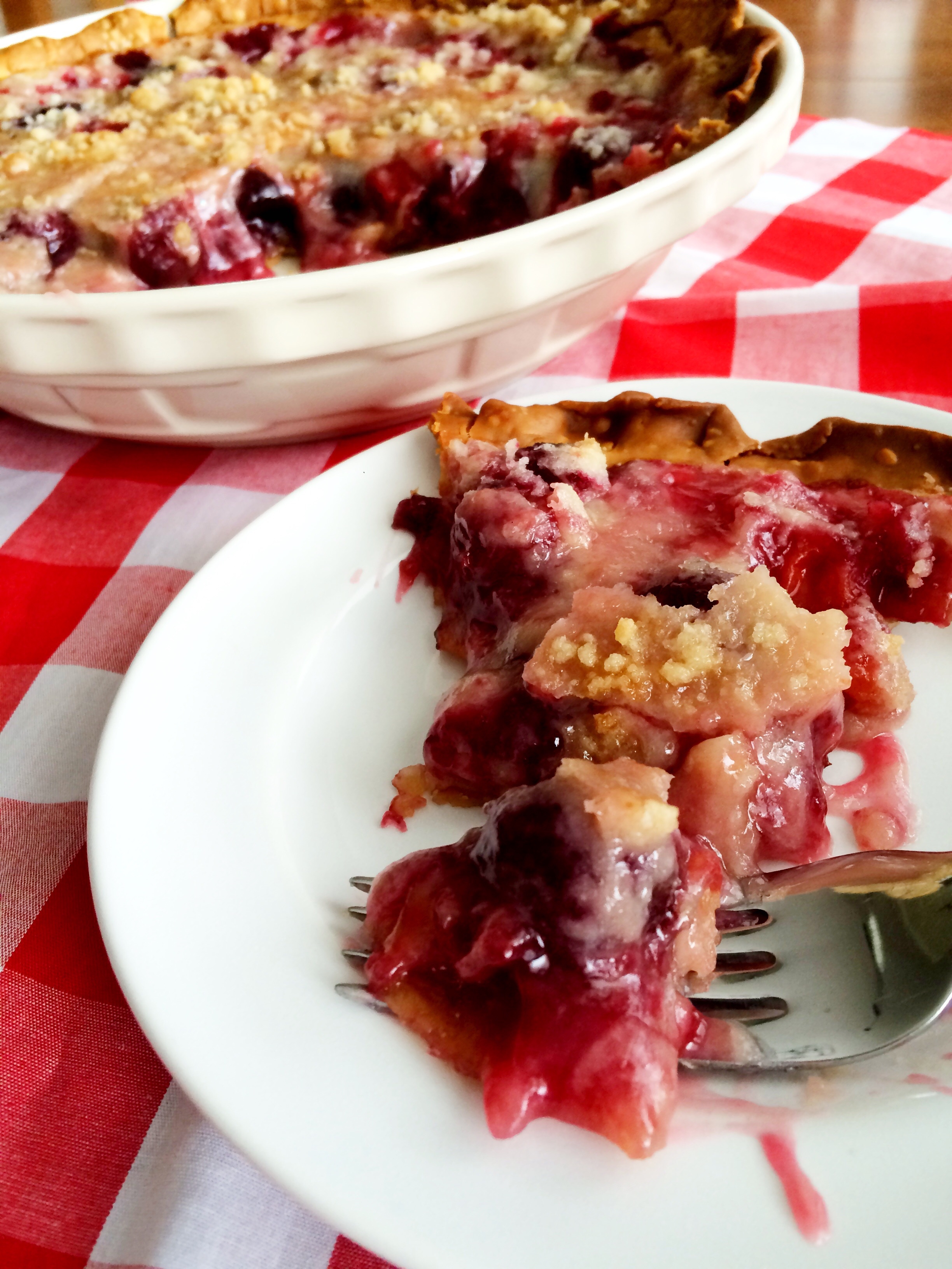 My husband has been putting in some LOOOONG hours lately…between planting, dirt work and cattle, the poor guy hardly gets to rest this time of year. One day last week we caught some rain, which usually translates to the equipment is stopped and my husband will be home for dinner. One of his favorite things to eat is his mother’s Cherry Pie recipe. When he gets rained out and will be home for a warm meal, I usually try to treat him to an extra special one. I decided to whip up a quick cherry pie, I did not have the right ingredients for a two pie crust, 🙂 I decided to get creative and try a crumb top cherry pie to change it up a bit. It turned out delicious…so delicious, I had to ward off the kiddos to snap a picture before they devoured it. Well, and then hide it so my husband could have some when he got home. This would be a perfect addition to your summer gatherings. Think Memorial Day, 4th of July….