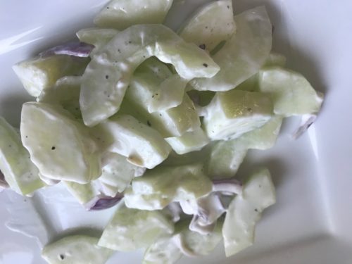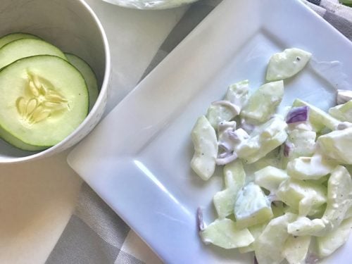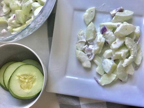 This is one of my favorite salads to use with fresh cucumber. It’s cool creaminess combined with the zestiness of vinegar and red onion are an appetizing and subtle combination. And of course, I always always think of summer when there is ample supply of all of our garden favorites.
