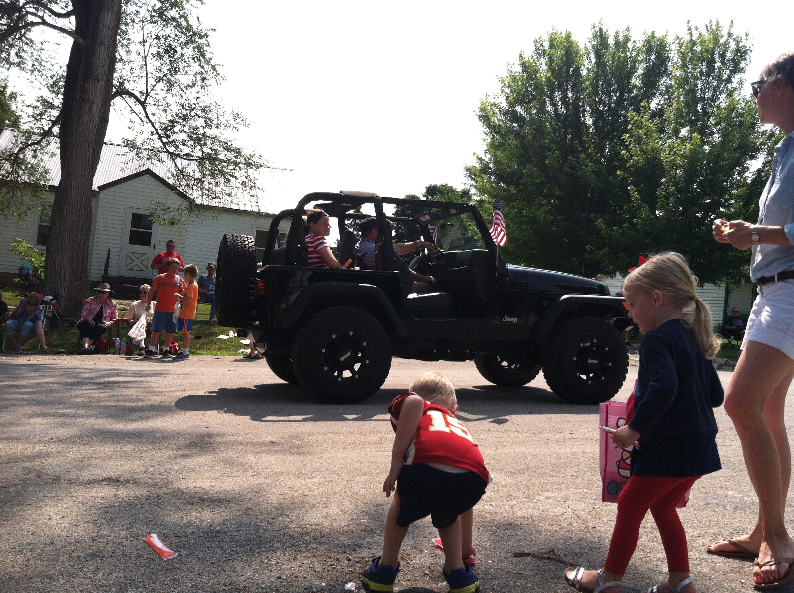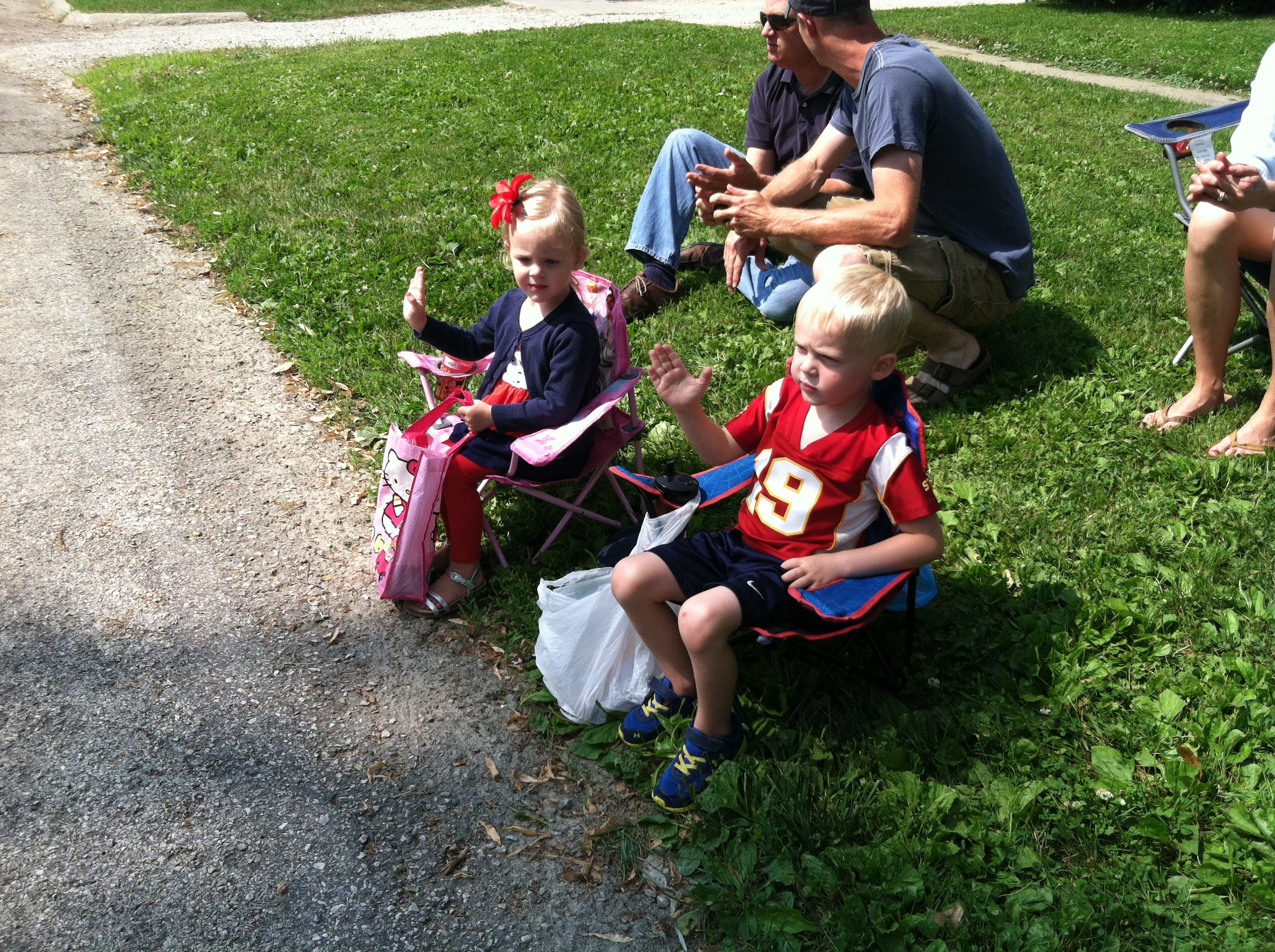 Mr. Farmer, Jen and I were invited to watch the colorful and interesting parade with Bill, Shelby and crew. The kids parked their little chairs in a nearly perfect spot….about a half ‘a block from where the parade route began, ……which meant that the participants saw those cute little blondies right off the bat and decided to be quite generous with their bags full of candy. Thomas and Anna were peppered with candy and memorabilia for a good 45 minutes! They loved every minute of it!