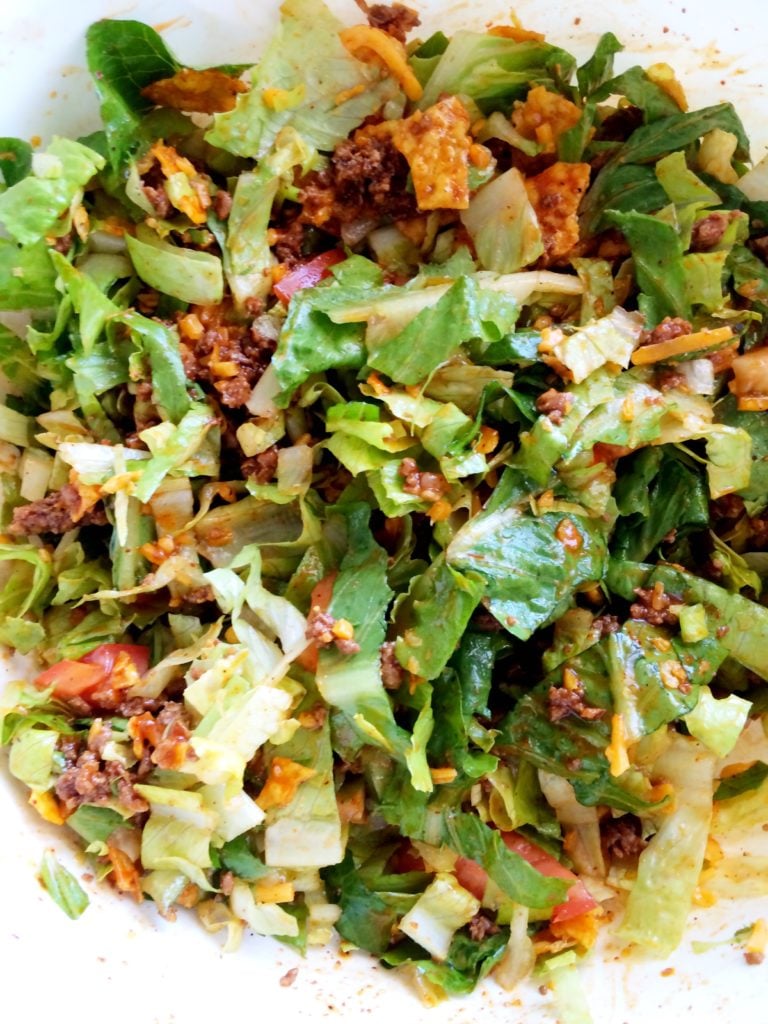 - In a large serving bowl, combine lettuce, tomatoes, cheese, optional beans, beef.