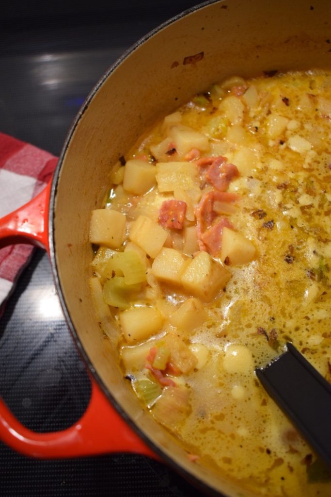 I add it near the end, after the potatoes are cooked through. The details are in step 2 of the recipe. Thanks for reading and I hope you love this soup.