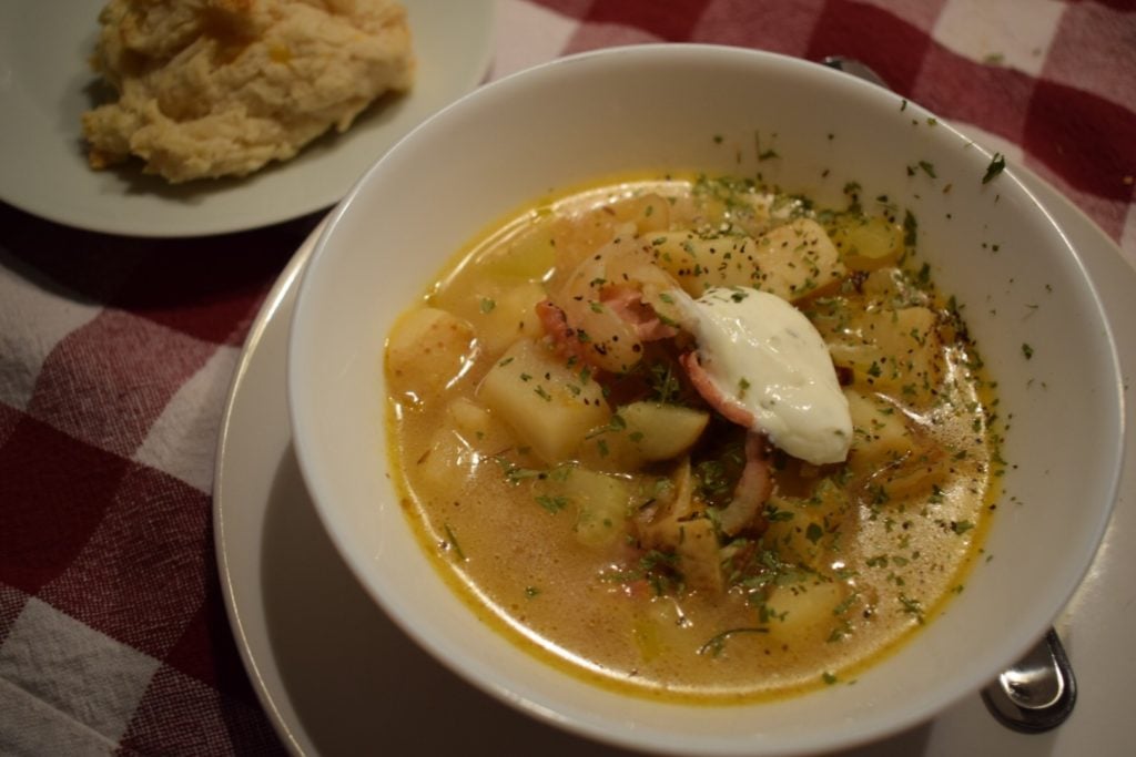 - In a large pot, cook onion and celery in 1 T olive or vegetable oil. Sauté until they begin to soften. Add garlic and hash browns and cook until garlic is fragrant. Season with salt and pepper.