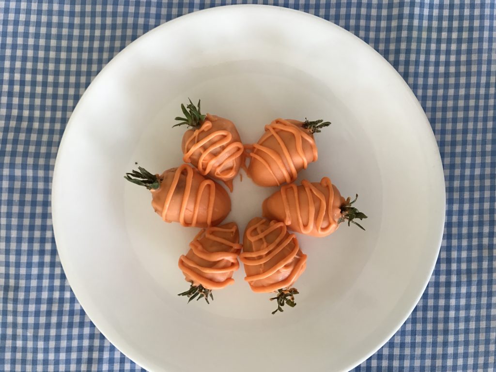 Last year for Easter my mom made a batch of these adorable chocolate dipped strawberries that looked like carrots. They were a hit with the kids and adults. The kids thought they were fun and the adults thought they were delicious! It enhanced the spring table setting with a fun edible treat!