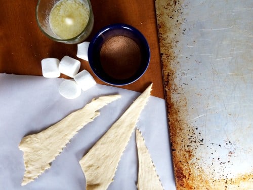 - Divide roll of dough along perforations to make 8 triangles. Combine cinnamon and sugar in a bowl. Melt butter in another bowl.