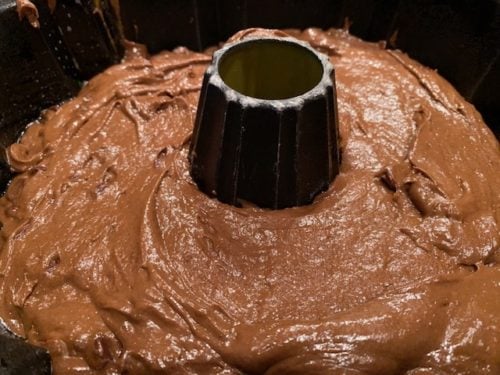 - Pour into greased bundt pan. Bake 45-55 min on middle rack.