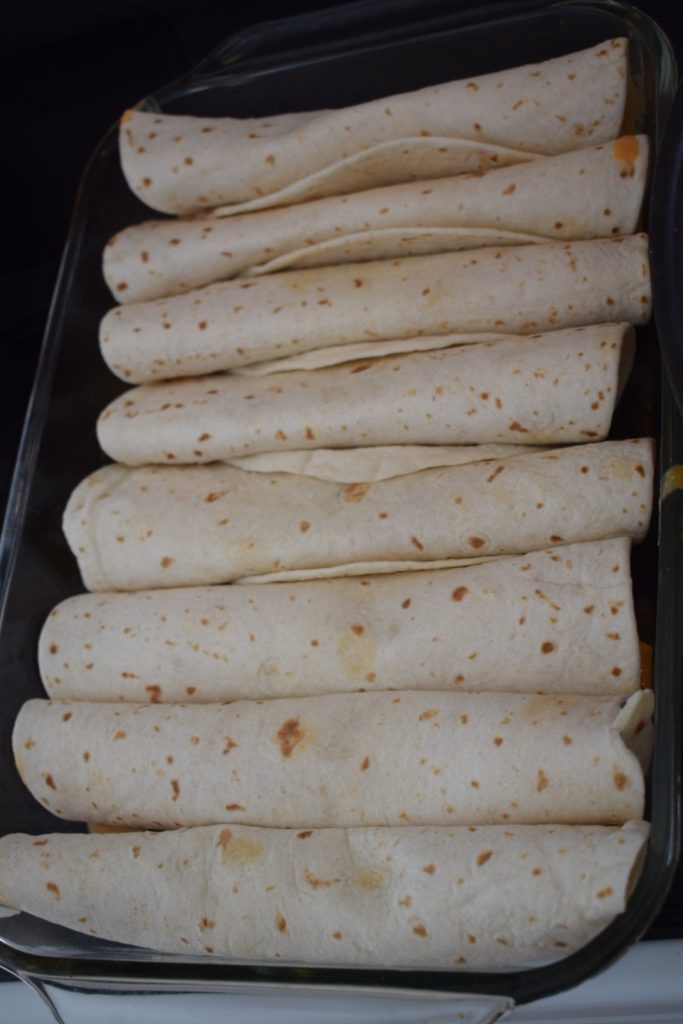 - Lightly spray to 13" x 9" baking dishes with nonstick cooking spray. Place one tortilla on a clean work surface. Spread ½ C filling along center of tortilla, gently roll, and place seam-side down in dish. repeat the process until all ingredients have been used.