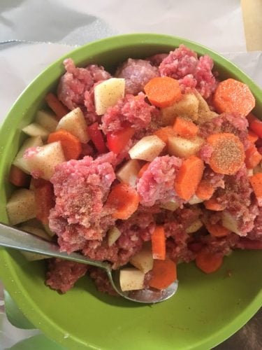 - In a large bowl, combine potatoes, carrots, onion, red pepper, and ground beef. Mix together. Then add seasoning salt, salt, and pepper.
