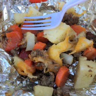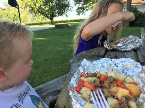 So, I’ve been trying to keep the meals as simple as I can with peanut butter and jelly sandwiches for lunch and basic snacks. I pack up the cooler in the morning and off we go for the day. When we are home in the evening, I typically try to grill as much as possible (less dishes this way – you know). Last week, I introduced the kids to “Girl Scout Dinners” (or they could easily be switched to, “Boy Scout Dinners”, too). They are super simple and all ingredients can be packed up together and wrapped in aluminum foil, then cooked either by campfire (or grill).