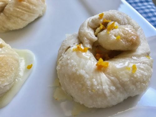 - Brush tops of knots with butter. Dip buttered tops in the sugar orange mixture.
