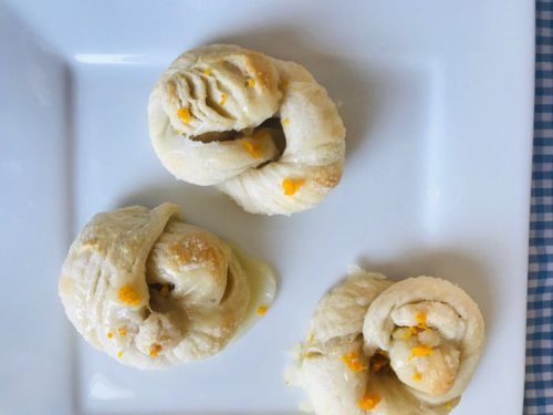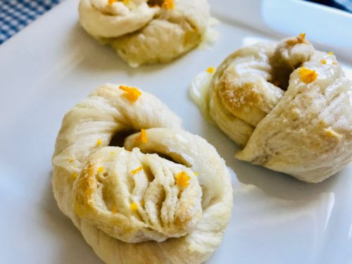 Orange rolls are a favorite of mine. I love the zesty orange with the sweet bread. What I enjoy about this recipe is that it’s much simpler than making homemade bread – it uses refrigerated biscuits (I use Pillsbury). So it’s semi-homemade 😉 The knots are pretty and fun to make. I thought these would be perfect for our Easter Sunday wake-up – keeping it uncomplicated for the meal ahead 🙂 Enjoy!