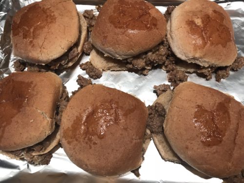 - Lay out the bottoms of the buns on the prepared baking sheet. Spread with the beef mixture on top and place the remain top. Melt butter in microwave and brush buns with butter. Cover with another layer of aluminum foil. Bake in preheated oven for 30 minutes Serve with sliced pickles and macaroni and cheese