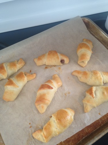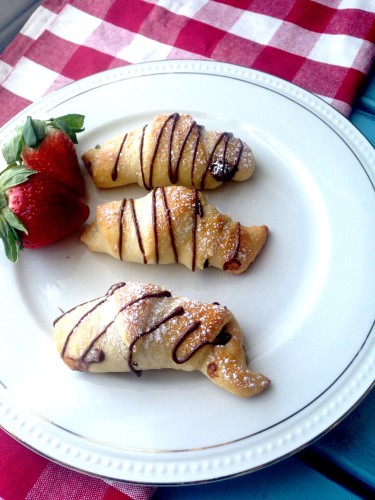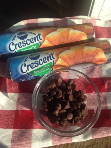 Our favorite bakery in town has chocolate croissants that are to die for. But because we lead busy lives and don’t often get to spend a leisurely morning at the bakery, we decided to try to make some chocolate croissants at home. Since I’ve never made croissant dough from scratch (and don’t think I’ll get to that soon!), we decided to take this short-cut approach.
