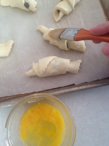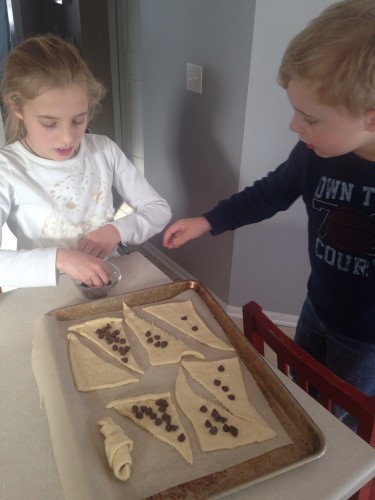 The kids laid out the dough, placed a few chocolate chips, and rolled them into a croissant shape. After lightly brushing with egg, we baked them and then drizzled a little melted chocolate on top. A final dusting of powdered sugar, and voila- delicious, warm, gooey, chocolate croissants.