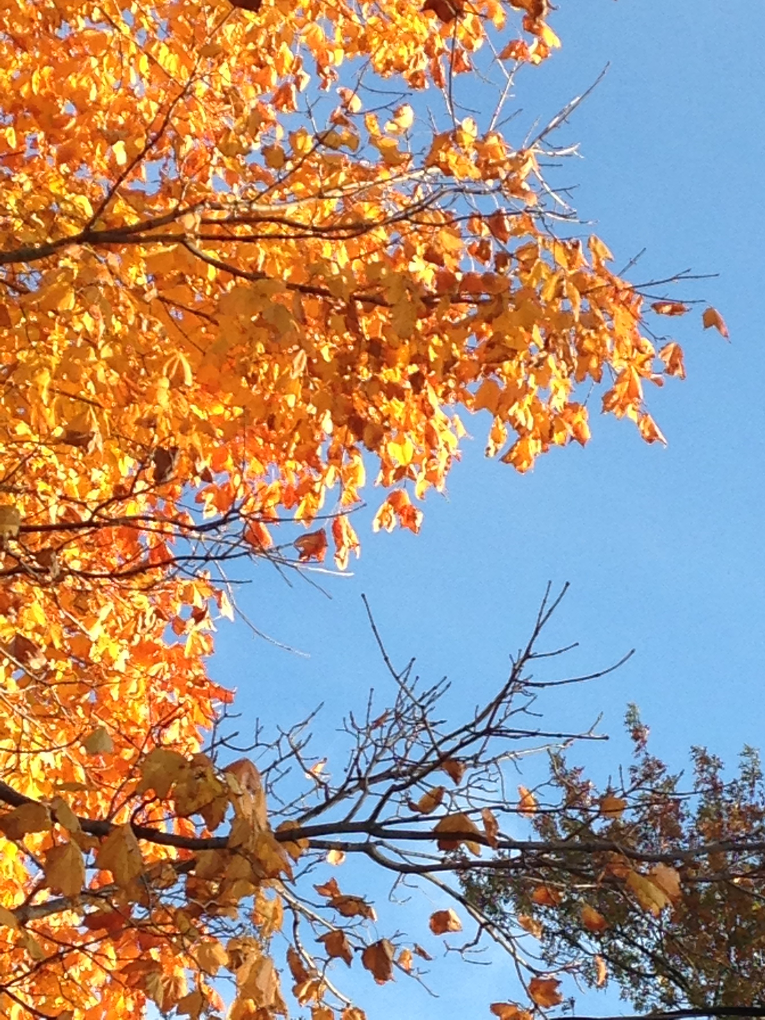 The other day, we were outside raking the enormous pile of leaves in the back yard from the maple tree ( these leaves seem to come down all at once). I looked up against the royal blue colored sky and there was a striking contrast between the bright blue and the gradient of yellow leaves in the foreground held together by the dark brown branch. Some of the leaves on the very outermost edge of the tree were tinged orange at the tips – and it was absolutely beautiful. Right then, in that moment, I told myself, ” I need to remember this beautiful radiance of colors.”