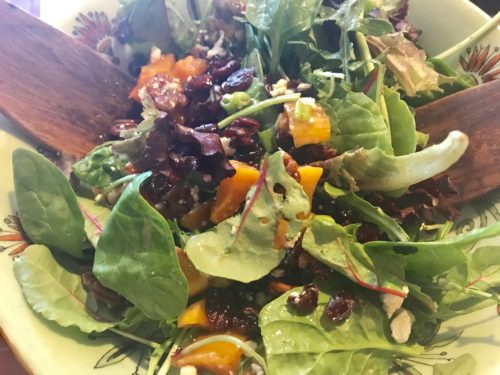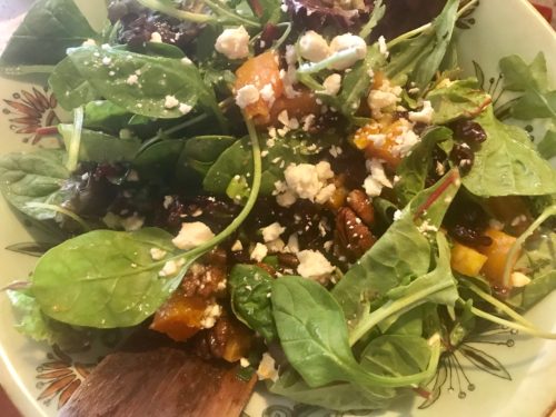 - Assemble salad by topping mixed greens with squash mixture, dried cranberries, feta cheese, and green onions.