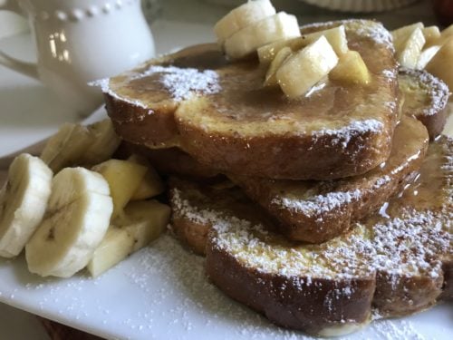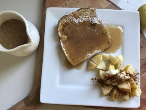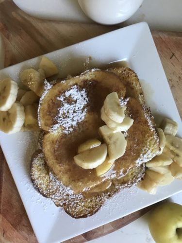 The final touches were needed – powdered sugar – cinnamon – and the freshly cut-up bananas and apples. Our joint effort was a hit! My only problem is that eveyone now asks for French Toast every Sunday…perhaps we’ve started a new tradition 🙂