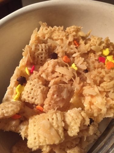 Browning the coconut and slivered almonds in the butter and brown sugar. Then add the Rice Chex and let it cool.
