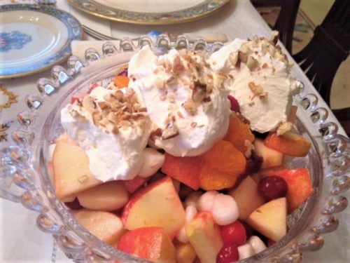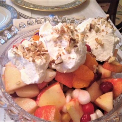 - Just before ready to serve, add bananas, and cranberries. Dollop with a heap of whipped cream and pecans.