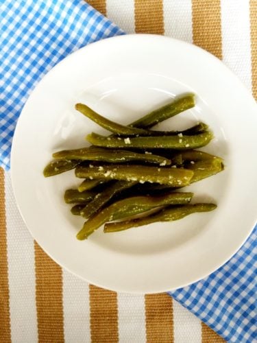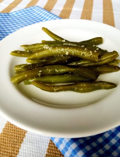 Yay, for generous friends with gardens! Just when I start to get bummed out that I didn’t plant a garden, one of my dear friends shares some of her fresh green beans with me. I enjoy fresh green beans just about anyway…snapped and washed, steamed, with a nice white sauce or my current favorite way steamed and then tossed with garlic, parmesan and a few other seasonings. Yum, perfect side to a grilled ribeye…or any meal. These green beans are full of flavor and healthy, be sure to give them a try this Summer!