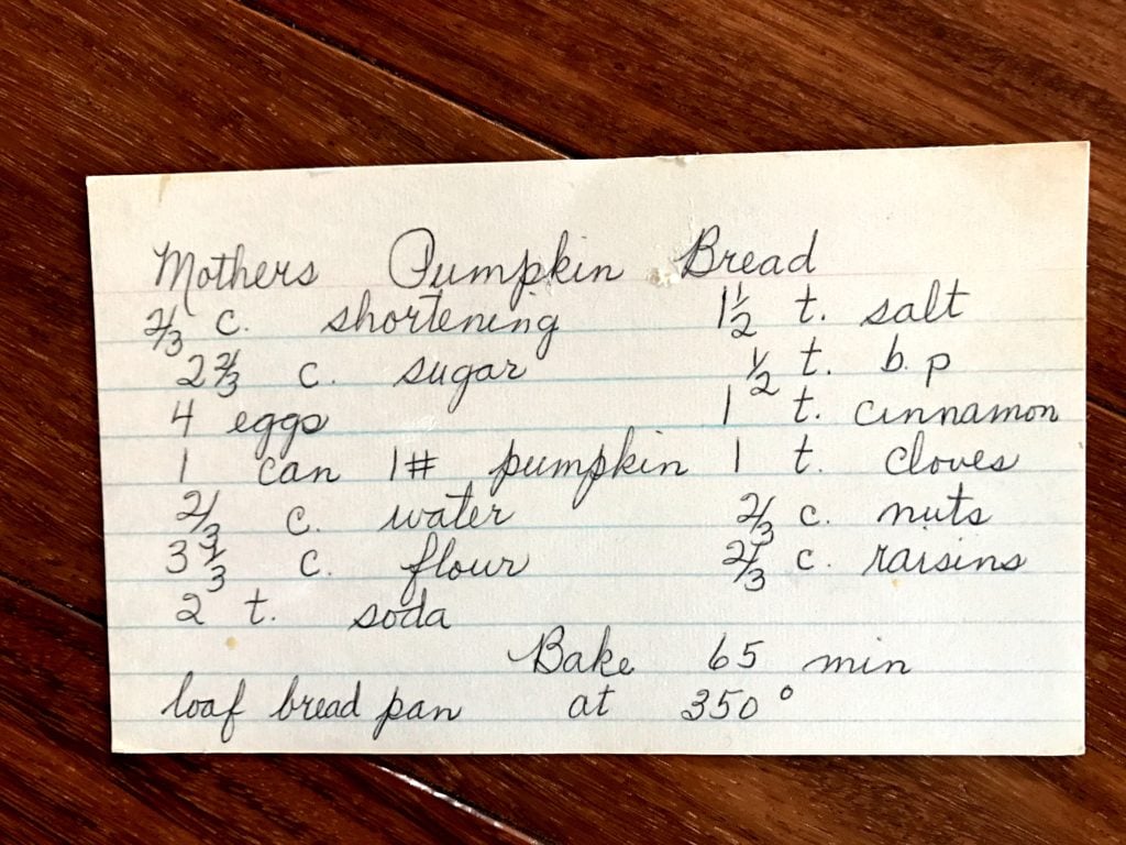 I have this large beautiful wood recipe box that use to be my Grandma’s and on the inside it’s filled with hundreds of handwritten recipes she collected over the years. There are many old and stained cards and many new with stars marked in the corner of it was really good. :). On occasion when I find myself missing my grandparents I reach for that wooden recipe box and thumb through the recipes. So many of them spark such fond memories. With fall quickly approaching I snagged my grandma’s pumpkin bread recipe and to my delight found that it was actually her mother’s recipe. Making it my Great Grandma’s Pumpkin Bread recipe. Now that’s standing the test of time. Enjoy!