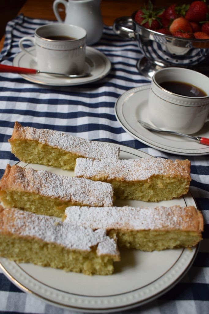 - Bake for 20-25 minutes. Let cool completely and then dust with powdered sugar. Slice into long