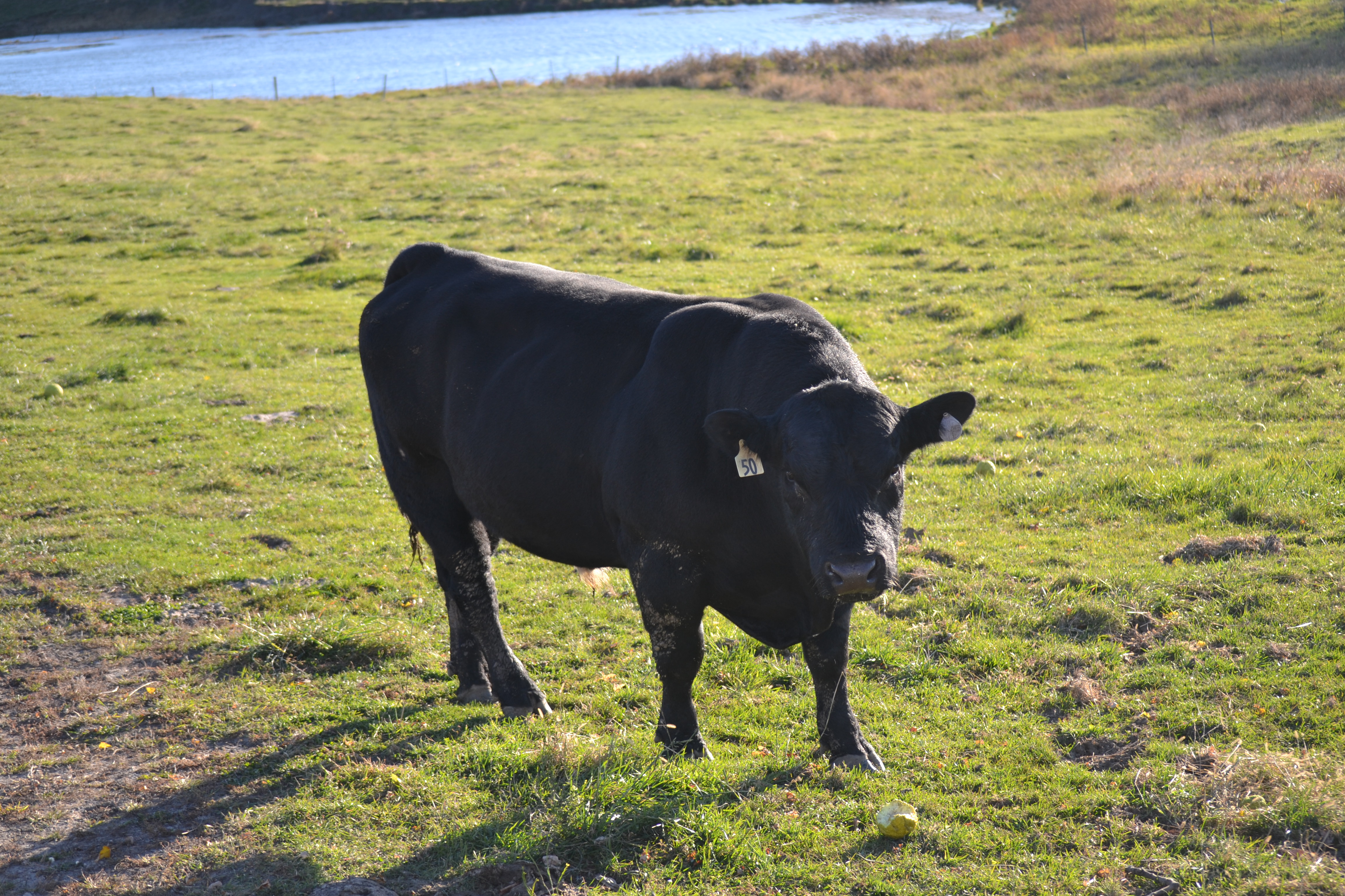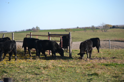 In the meantime, the cattle are happily eating off the still green pasture. Mr. Bull continues to enjoy another hedge apple from the osage orange trees. I certainly hope it’s alright for him to eat! 🙂