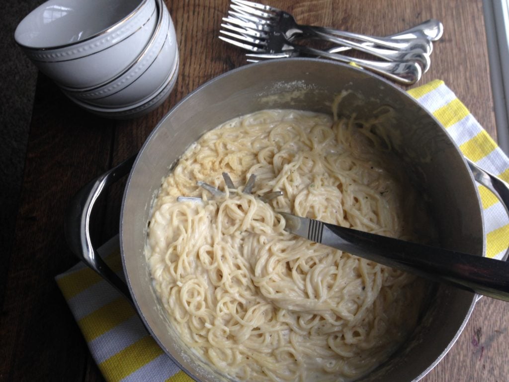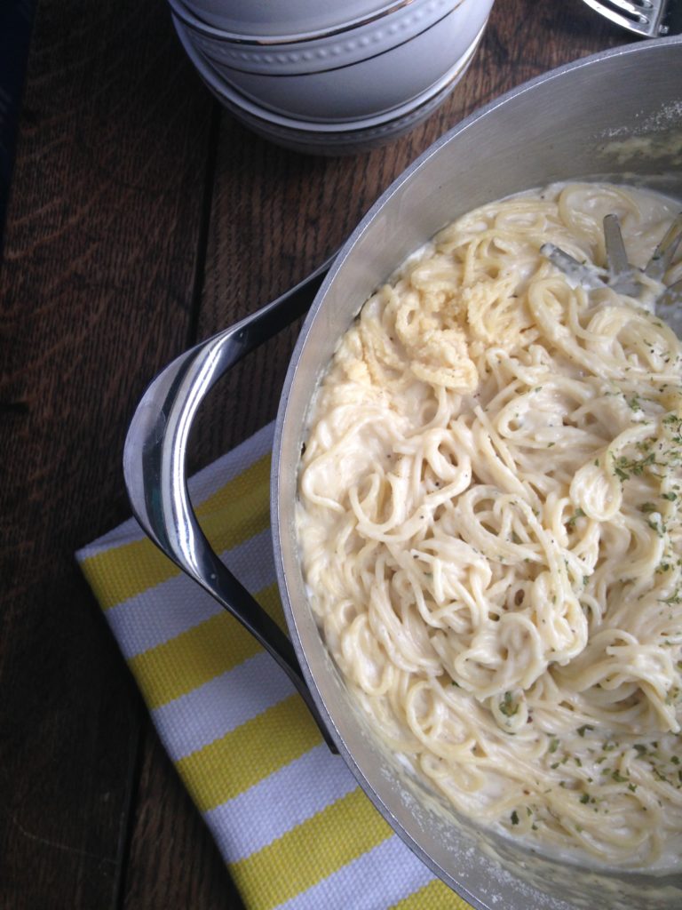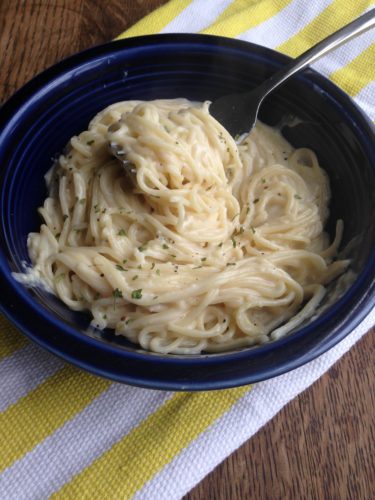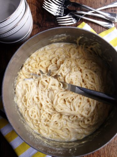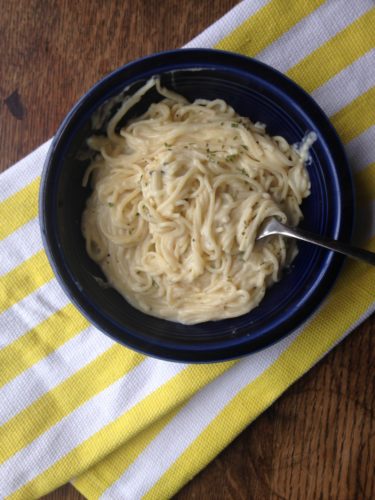 But back now to her fettuccine… it is truly a wonderful recipe, as all Grandma’s recipes are. It’s so fun to make it for my kids and share some memories while we eat. It’s simple, comforting, and delicious, perfect for a fall night. (As you can see in the pictures, you can use any pasta you’ve got on hand. We didn’t have fettuccine in the cupboard the other night, and spaghetti worked just fine!)