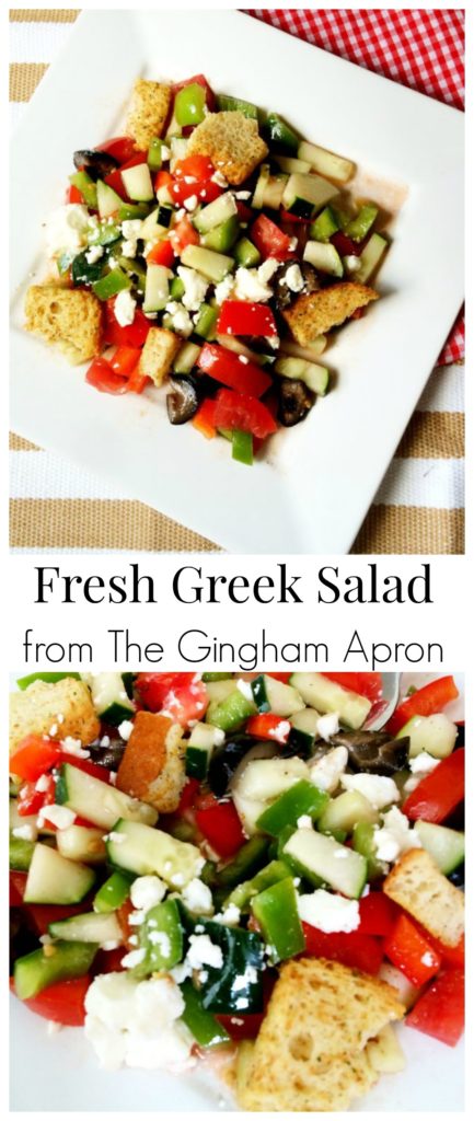 There is just something about a summer salad made with fresh ingredients. I’ve already professed my gratitude to my generous friends with their booming gardens. Without them, this salad would not be here. Well, that and also my Greek(ish) cousins (I guess you would say they are half Greek, my Aunt married a Greek man)…anyway, over the years they have broadened my horizons to some Greek foods. Although as a young girl the sight of them eating olives and feta cheese was nothing short of appalling to me, I have taken note with my age and now enjoy food with some Greek flair. Thanks ladies!