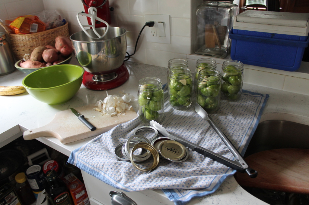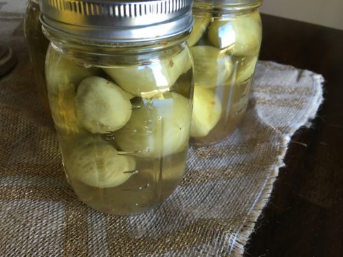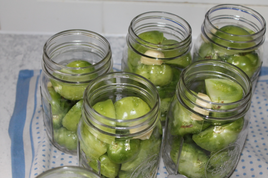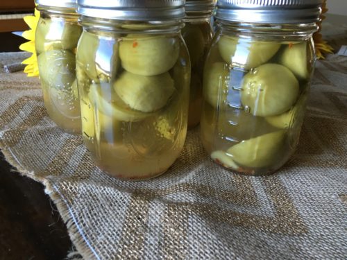 My husband grew up enjoying these green tomato pickles, and now I have grown to love them too. They are kind of a quirky thing, but they are quite easy to can and are even better than pickles if you’re going for something salty and crunchy.
