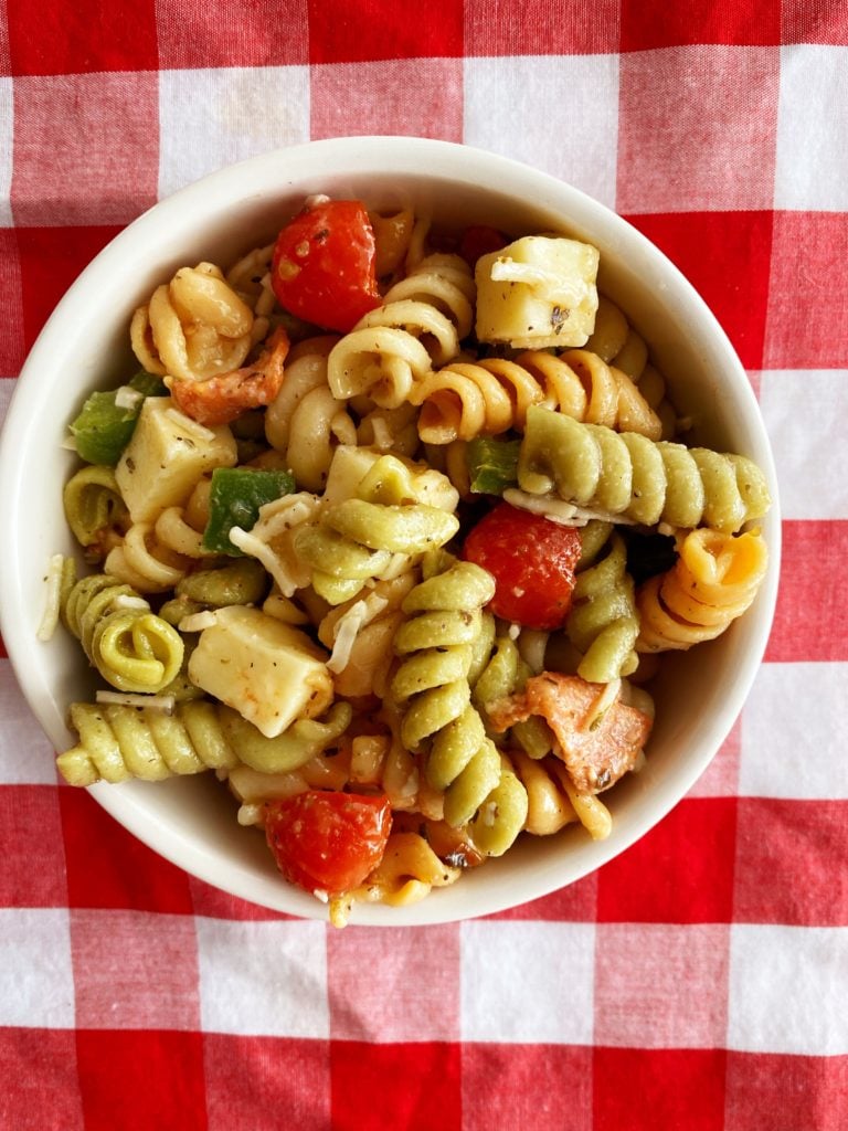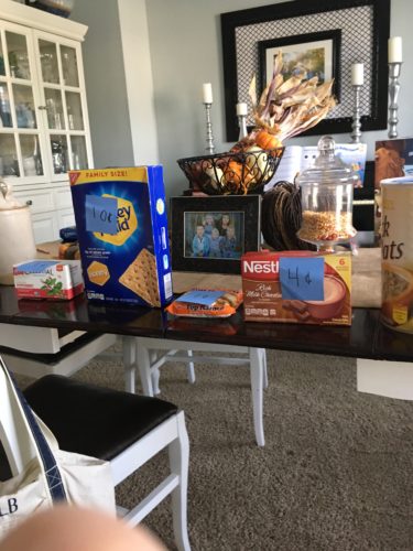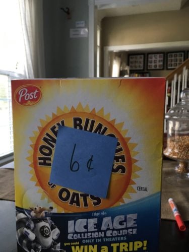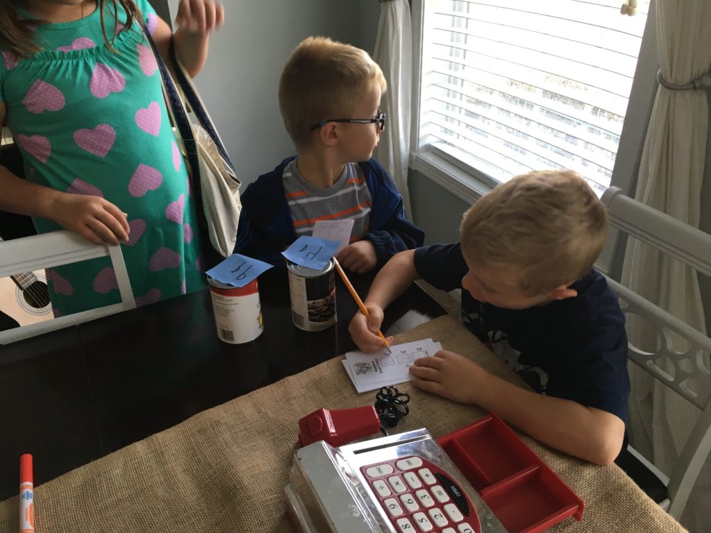 To play grocery store math, we just choose 10-15 items from the cupboard and turn the dining room table into the store. I have my first grader write the prices on some sticky notes. He is currently doing single digit addition, so each “price tag” just has one number.