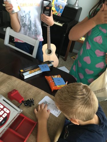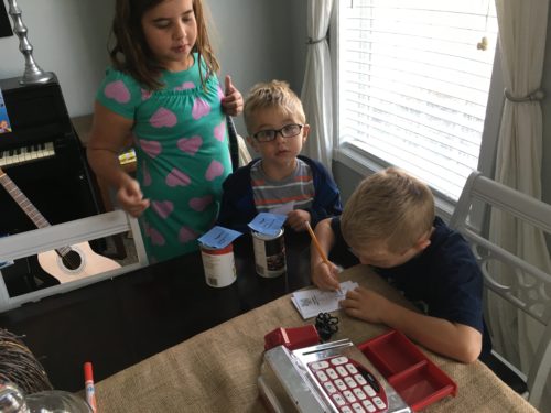 So cute! Grocery store math is simple, sweet, and fun. The kids played this so nicely for over an hour. My older kids said, “Oh! I remember this game from first grade. I loved it!” They jumped right in and were eager customers and encouraged Matthew in his addition. It is moments like this that make home schooling really special.