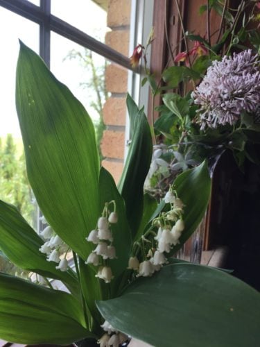 The lillies of the valley on the left—-I just love these little aromatic bells. Could smell them all day. We have many, many plants of these around our farm. I’ll share. 🙂