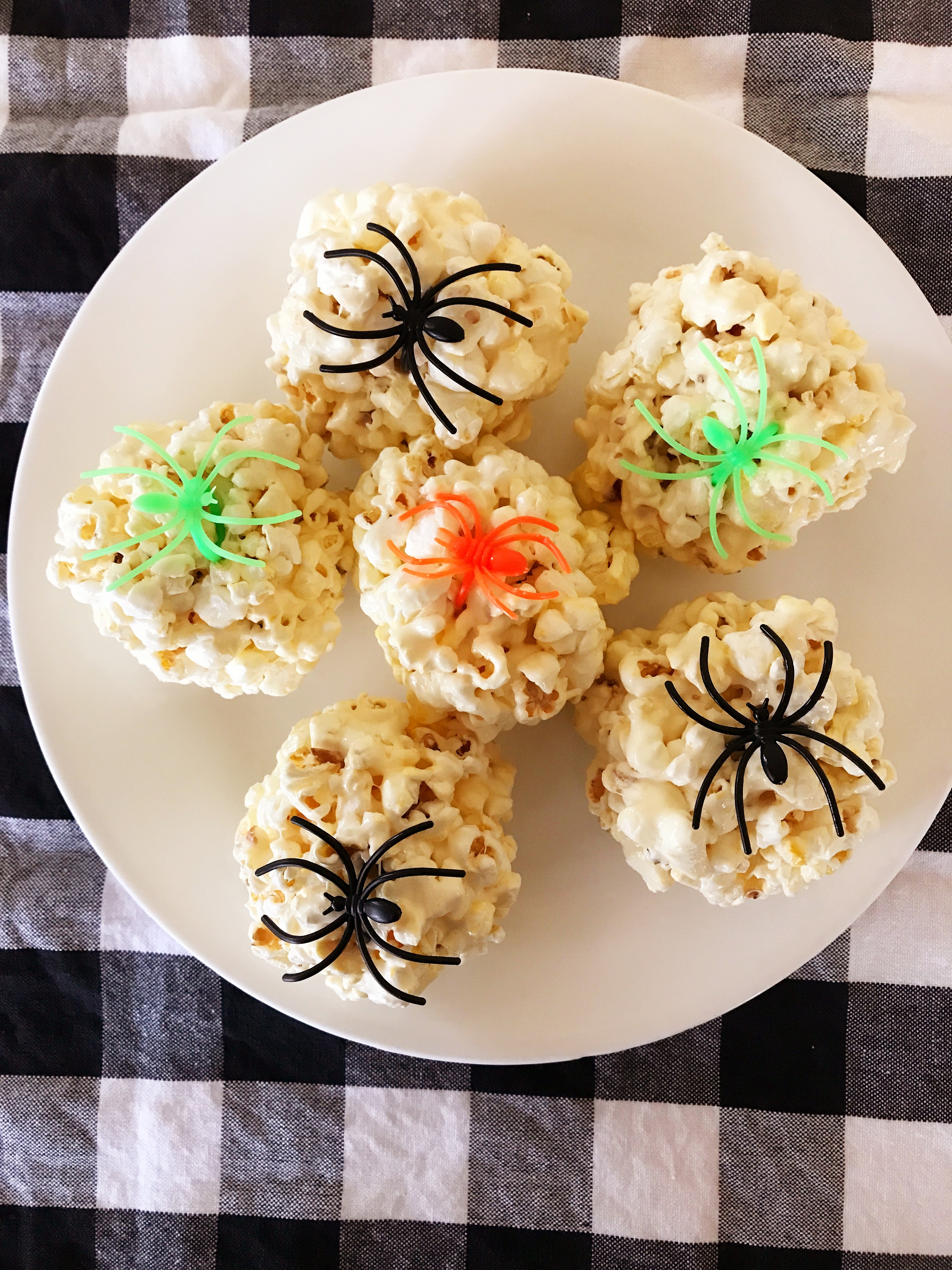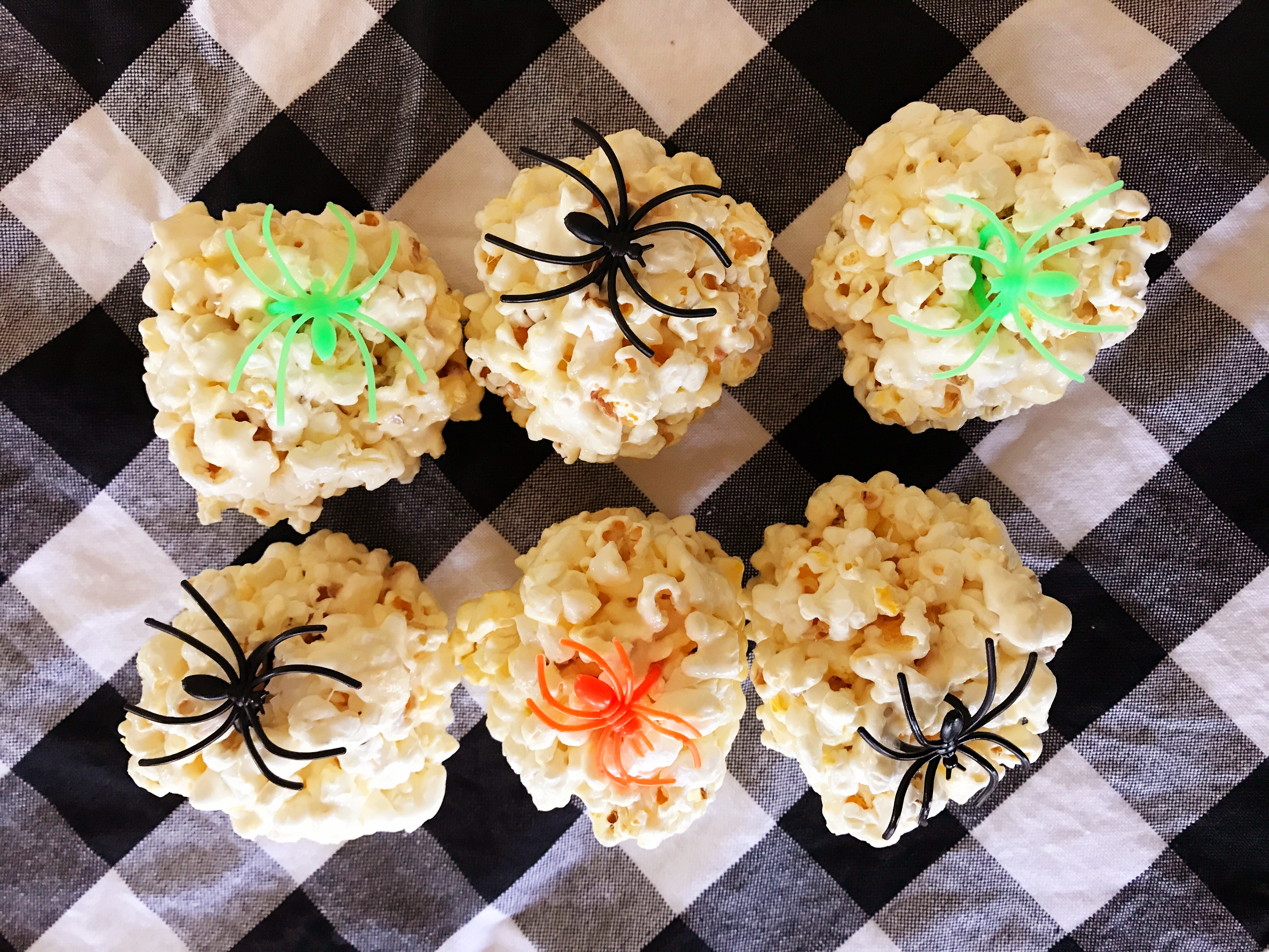 - Shape into 10 (3 inch) balls with lightly greased hands and place onto sheets of waxed paper. Place a plastic spider ring on top of popcorn ball and let stand until firm