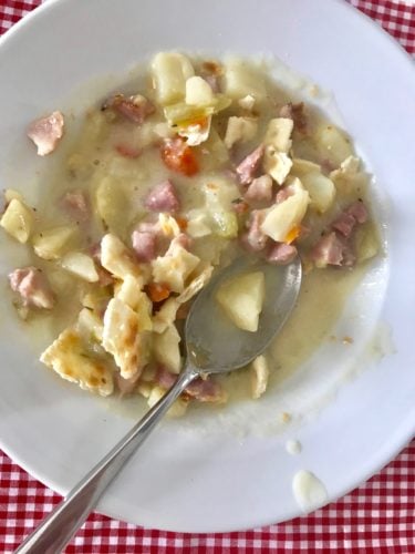 We’ve been keeping busy indoors with crafting, movies, puzzles, and games. Repeat and repeat. 🙂 I love having a pot of soup to warm up with during these incredibly chilly days. I saved some of our leftover ham from Christmas; it made this soup so easy to pull together. The garlic aroma gives off some wonderful smells. The potatoes add heartiness. It’s a tasty soup that is just the ticket for grazing and staying cozy.